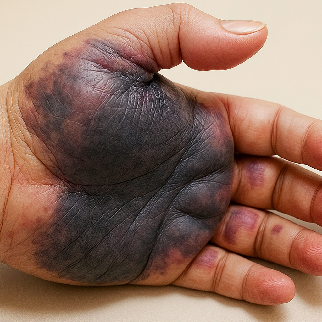 A large blood blister on the hand is a raised pocket of skin filled with blood caused by injury that breaks tiny blood vessels without breaking the skin. It appears red, purple, or black and can cause pain or discomfort. These blisters usually heal on their own within a week